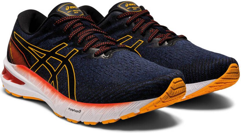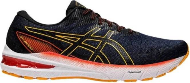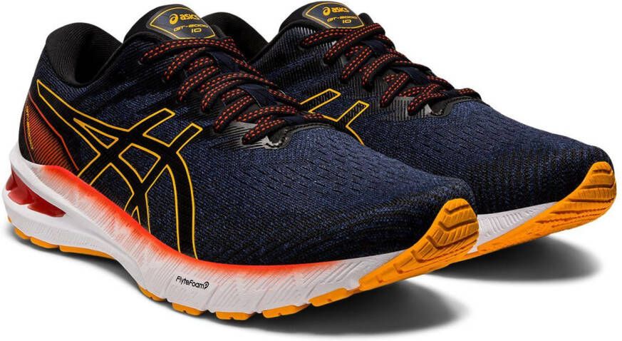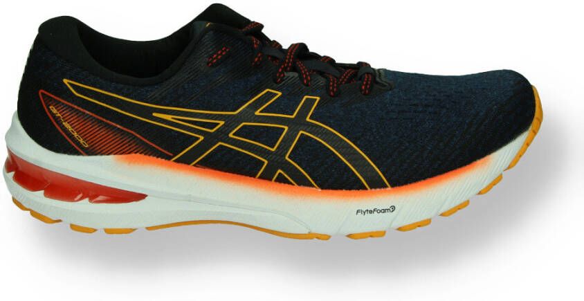 Specificaties: * Pasvorm: standaard breedtemaat; Asics sportschoenen vallen klein, advies om een maat groter te bestellen; vetersluiting * Pronatie: overpronerend * Demping: FLYTEFOAM™ propel-demping onder de voet zorgt voor een meer responsieve veerkracht aan je pas; GEL™-dempingstechnologie in de achter- en voorvoet zorgt voor uitstekende schokabsorptie; 3D SPACE CONSTRUCTION™ van de tussenzool verbetert de compressie; LITETRUSS™-technologie voor een betere ondersteuning van de middenvoet * Bovenwerk: mesh is soepel en ademend * Buitenzool: slijtvast, dempend rubber * Gewicht: 280 gram * Offset: 8mm * Kleur: donker blauw oranje * Materiaal: textiel synthetisch materiaal rubber.